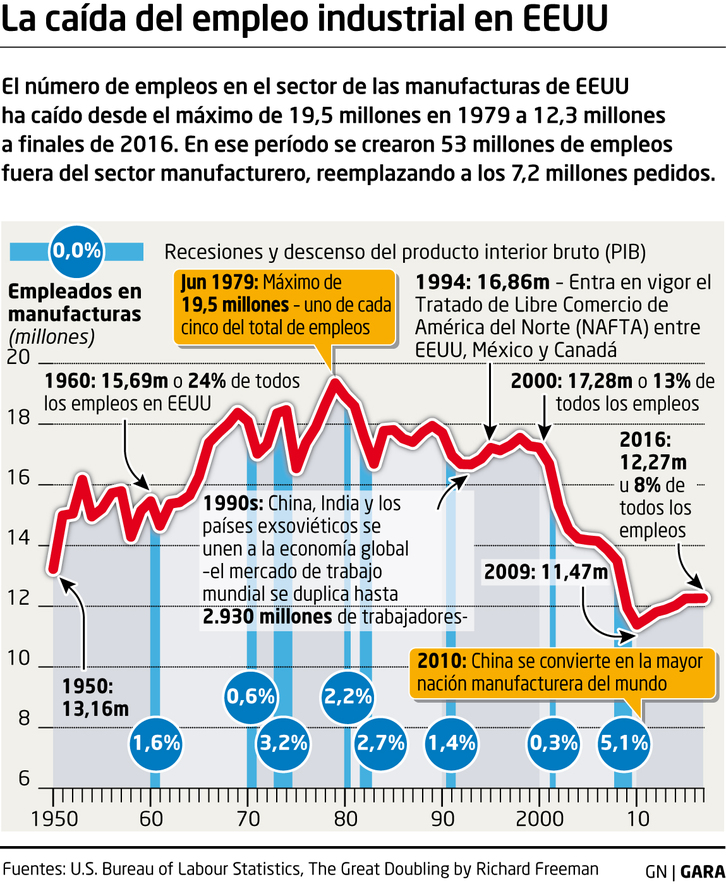Y si nos ceñimos a la etapa que va desde 1979 –cuando la industria llegó a sostener 19,55 millones de empleos– a 2016, hay que subrayar que frente a la pérdida de 7,2 millones de empleos, la economía de EEUU creó otros 53 millones. Evidentemente, esos nuevos puestos de trabajo se han creado en otros sectores y son los que han levantado, por ejemplo, las grandes empresas tecnológicas de Silicon Valley o, incluso, las entidades financieras que tanto tuvieron que ver en el estallido de la Gran Recesión hace menos de una década.