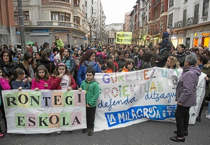 En Barakaldo, la comunidad educativa de La Milagrosa se manifestó por la mañana y lo volvió a hacer por la tarde, aunque no fueron los únicos. También lo hicieron por la tarde quienes conforman la comunidad del colegio Rontegi que marcharon por las calles de la localidad fabril hasta la Herriko Plaza, donde se unieron a la columna que partió desde La Milagrosa con un lema conjunto: ‘‘Defendamos nuestros proyectos educativos. ¡No al cierre de La Milagrosa!’’. Cientos de personas reivindicaron una solución.