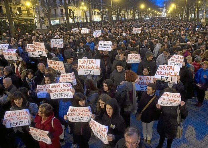 La concentración comenzó a las siete de la tarde en el Paseo de Sarasate, enfrente del Parlamento, donde fue colocada una pancarta con el lema “100 egun bahituta. Muntai polizialik ez. Stop montajes policiales”.