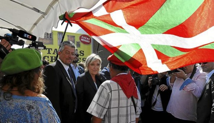 Lerroon gaineko irudiak bestelakorik pentsaraz lezakeen arren, Marine Le Pen eta Fronte Nazionaleko gainerako ordezkariak ez dira –guk dakigula– euskal ikurren zale bihurtu; ez dabiltza batean-bestean ikurrina haizatzen hauteskunde presidentzialen bezperotan. Okzitaniako Six-Fours-les-Plages herriko merkatuan harrapatu zuen argazkilariak Le Pen traza horretan, postu batean zintzilikatutako ikurrinak itzal egiten ziola.Franck PENNANT | AFP PHOTO