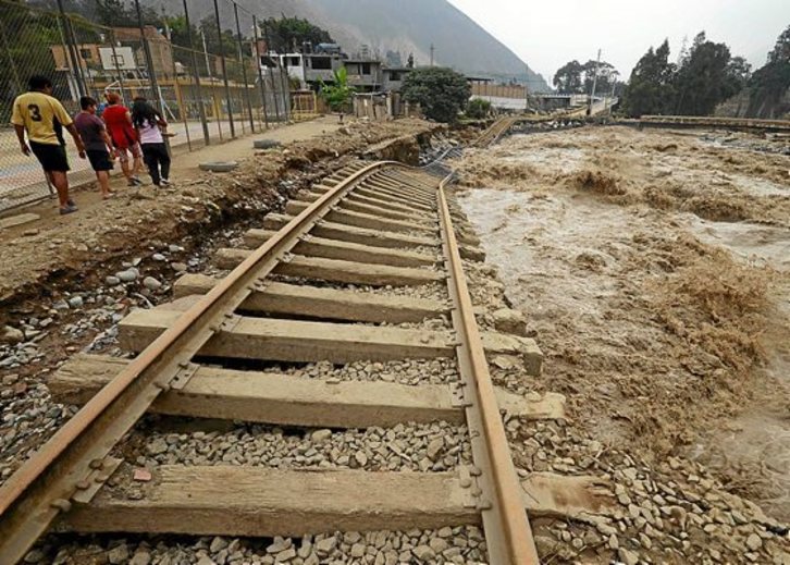 Perú comenzó el lunes a recibir la ayuda humanitaria enviada por países vecinos como Ecuador, Colombia y Chile para enfrentarse a las consecuencias de las lluvias e inundaciones, que han dejado, hasta el momento, 75 fallecidos y 100.000 damnificados. Las fuertes lluvias han causado desastres de proporciones descomunales, producto del fenómeno climático El Niño. El lunes destruyeron más de un kilómetro de vías de un ferrocarril que transporta minerales, el cual pasaba por los Andes centrales hasta la costa del Pacífico. La importancia de dicha vía radica en que Perú es uno de los principales exportadores de minerales, los cuales, en su mayor parte, son exportados a China. El ministro de Transportes, Martín Vizcarra, dijo ayer que buscan vías alternas para transportar los minerales y calculó «más de dos semanas» para la reconstrucción. Más de la mitad de la nación declaró un estado de emergencia. Las lluvias afectaron a 626.000 personas y provocaron daños en 117 puentes y en el 6% de las carreteras nacionales. GARA