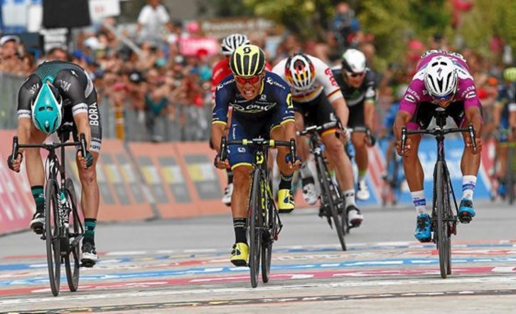 Caleb Ewan (Orica) sigue creciendo como ciclista profesional y a sus 22 años ganó ayer su primera etapa en el Giro de Italia. El esprinter australiano fue el más rápido y el más hábil en los complicados metros finales de la séptima etapa, una larguísima jornada de 224 kilómetros entre Castrovillari y Alberobello. Ewan, que ganó su primera etapa en una ronda de tres semanas en la Vuelta de 2015, supo arrancar antes que sus rivales para entrar por delante en la última curva y batir por centímetros a Fernando Gaviria (Quick Step) y Sam Bennet (Bora). Greipel (Lotto Soudal) se quedó cerrado y acabó cuarto, sin opciones de victoria. La escapada del día, sin futuro en ningún momento, corrió a cargo de Dmitriy Kzontchuk (Gazprom) y Giuseppe Fonzi (Wilier).