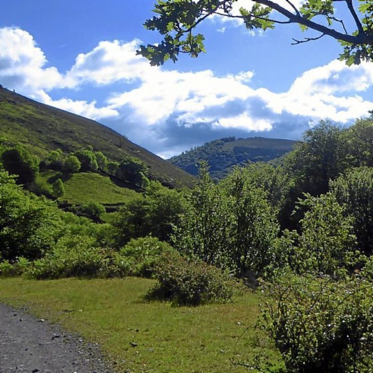 Atravesada de nuevo toda la majada en descenso, al alcanzar la última borda, notamos los efectos de las brujas y nos salimos por un camino que nos lleva a la erreka principal, donde pasamos al otro margen, y que inicialmente retrocede. Este tramo permite visitar la erreka que desde los montes del S se dirige al baserri principal, Asurako Beheko Etxea, hasta que un giro repentino a dcha. nos permite recuperar la dirección de bajada. Así transitaremos durante unos 2km, por camino ancho y ligeramente ascendente.
