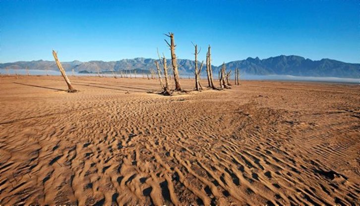 El Gobierno sudafricano ha declarado el estado de «desastre nacional» en la provincia de Cabo Occidental, que incluye a Ciudad del Cabo, con el fin de hacer frente a problemas admnistrativos y facilitar y desplegar los recursos necesarios para hacer frente a la sequía que azota la zona, la peor de los últimos 110 años. En la imagen, estado de la presa Theewaterskloof, que cuenta con menos del 20% de su capacidad de agua.Rodger BOSCH | AFP PHOTO