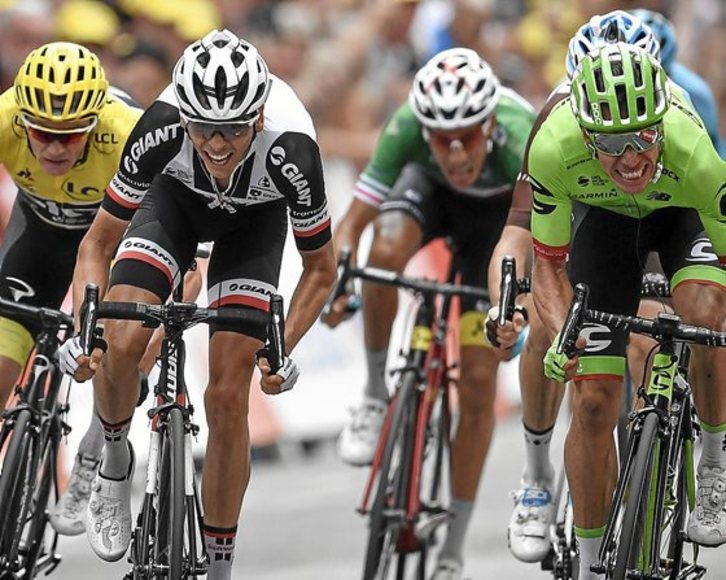 El colombiano había decidido cambiar este año de calendario tras cinco años en los que se centró en el Giro –en el que ha ganado dos etapas y fue segundo en 2013 y 2014–. No conocía la victoria desde que llegó el año pasado al Cannondale y parecía que ya no estaba en disposición de disputar las generales, pero apostó por el Tour y ayer fue el más fuerte porque no solo ganó. Lo tuvo que hacer sin poder cambiar el piñón (sprintó con un 53x11) porque Dan Martin le inutilizó el cambio en su caída. Pese a ese problema fue capaz de responder a los ataques de Froome y Fuglsang en el último kilómetro y superó a Barguil por centímetros.