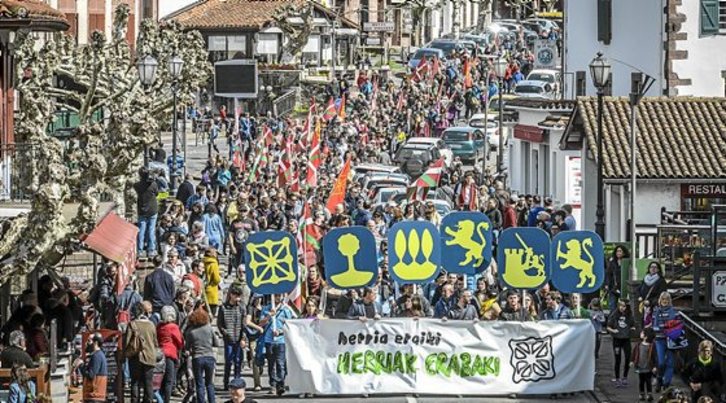 Etxerat elkarteko kideak karrikak euskal presoen aurpegiekin atontzen ari ziren oraindik Donibane Garaziko merkatuan jendea pilatzen hasi zenean, eta eguzkia gero eta gertuago zegoela zirudien. Aitzina eta EH Baiko militanteek “Herriek eraiki, herriek erabaki” zioen pankarta ireki zuten, eta, bigarren lerroan, Euskal Herriko zazpi lurraldeetako armarrien irudiak zituzten lagunak ezarri ziren. Jarraian, independentziaren aldeko oihuekin abiatu zen antolatzaileen arabera 1.500 lagun bildu zituen ekitaldia.
