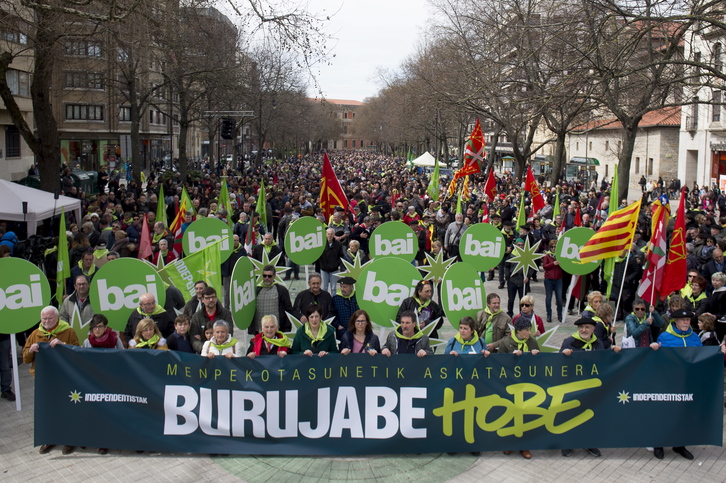 Justo antes de que arrancara la marcha, Txutxi Ariznabarreta (portavoz de independentistak) atendió a los medios. «En esta situación pensamos que no vale de nada ponerse de rodillas y rogar al Estado. La única alternativa es abrir un proceso soberanista también en Euskal Herria, construir nuestro Estado democrático y social y proclamar la República Vasca», afirmó.