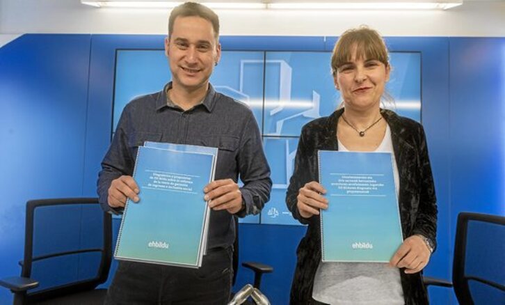 Desde la crítica a la proposición de ley registrada por PNV y PSE para la reforma de la RGI, EH Bildu presentó ayer su propia propuesta, que pretende «mejorar, ampliar y legitimar el sistema de protección social», basada en el «consenso alcanzado por los agentes sociales». Nerea Kortajarena e Iker Casanova mostraron su deseo de llegar a acuerdos.