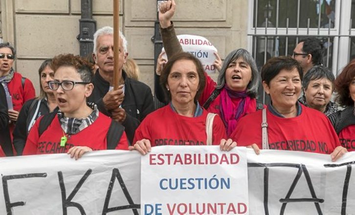 «Nahiz eta epaitegiak arrazoia eman eta Gasteizko Legebiltzarrak egoera honen irtenbiderako agindu zehatza eman, Eusko Jaurlaritzak, gehiengoa emakumezkoak diren sektore honetan, horrelako egoera prekarioa mantentzea proposatzen du», salatu zuten lau sindikatuek. Lakuako Gobernuaren aurrean elkartu ziren langileak. Bertan eztabaidatzekoak ziren atzo beren egoerari buruzko mozio bat, Elkarrekin Podemosek aurkeztua, baina azkenean atzeratu egin zuten ekimena.