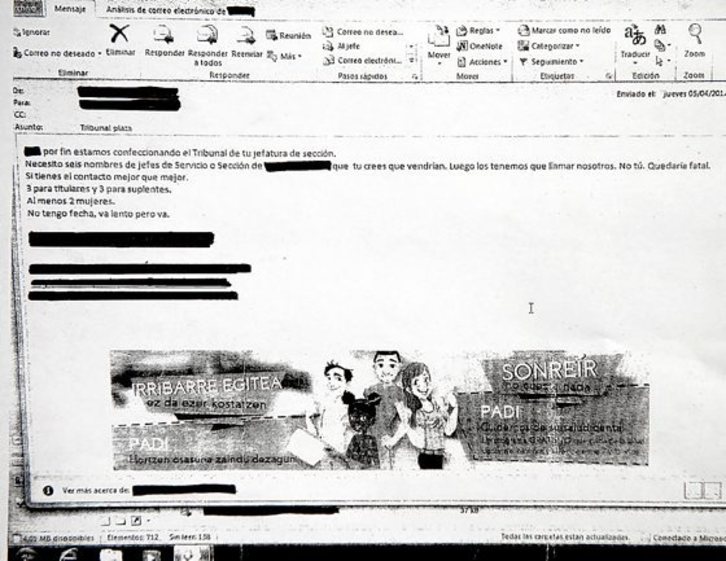Llegara como llegara la copia del correo electrónico a EH Bildu, su contenido está ahí, y en él figuran los datos de la remitente de la petición y la de la receptora a la que se le pide que elija ella misma a miembros del tribunal que va a juzgar su acceso a la jefatura de sección.