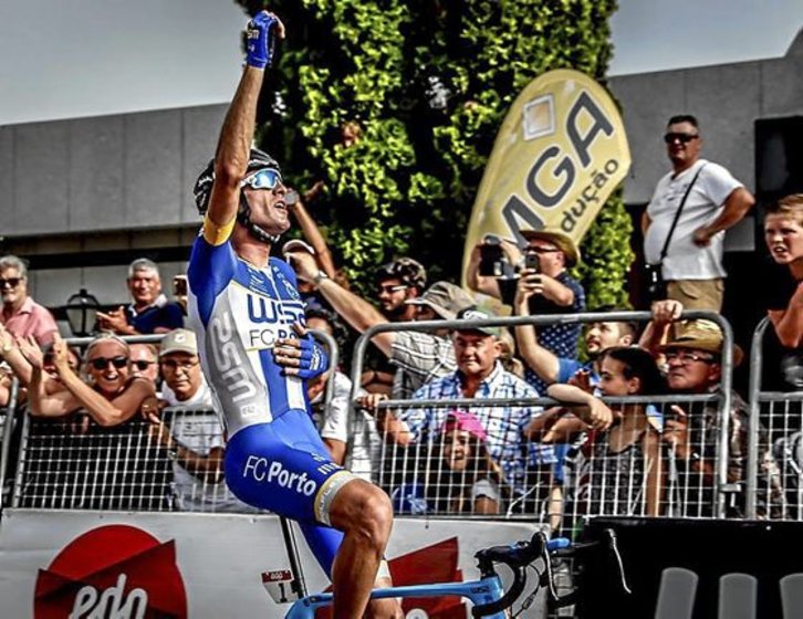 Los Murias Beñat Txoperena y Gotzon Udondo, y elCaja Rural Jon Irisarri estuvieron en la fuga previa alsalto en pos del triunfo del español del W52 Porto.