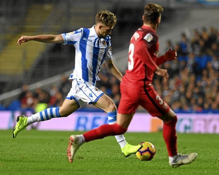 Asier Garitano presentó un once muy similar al que empató el jueves en Vigo. Repitieron siete de los diez jugadores de campo, todos menos Illarramendi, Juanmi y Willian José, que además fueron los tres cambios en la Copa. De jugar con nueve canteranos en la última victoria de San Mamés pasaron a jugar cuatro en el once que se podía esperar cuando se confeccionó la plantilla en verano con Januzaj en la banda derecha y Oyarzabal en la media punta por vez primera esta temporada. Juanmi completó la línea de tres de un 4-2-3-1 en el que destacó que Aritz Elustondo siguiera en el lateral derecho con Diego Llorente y Héctor Moreno como centrales. De todos ellos fue el que menos se podía esperar, Januzaj, el que mostró otro ritmo distinto a sus compañeros. Casi todas las jugadas de ataque las protagonizó él, aunque en la mayoría buscó el remate sin una buena posición. Estuvo demasiado individualista, pero fue lo mejor del partido.