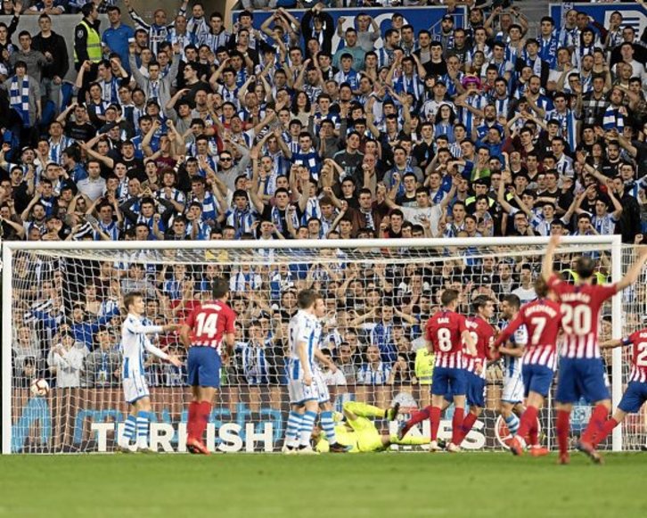 Los goles del Atlético llegaron a balón parado en unos minutos en los que se acusó el golpe que supuso la lesión de Willian José. En el primer cuarto de hora la Real controló el balón y el partido con el mismo once que ganó el último partido de Anoeta contra el Leganés con el cambio obligado de la presencia de Sandro por el lesionado Januzaj y con la vuelta de Theo y Willian José tras cumplir su sanción en Girona. El canario jugó en la banda izquierda y Oyarzabal pasó a la derecha, pero ninguno de los dos puede suplir a Januzaj. Es el jugador que aporta algo diferente en esta Real, porque Sandro y Theo no tienen sus luces y sin claridad no pueden sacar provecho a otras buenas cualidades que tienen. El equipo blanquiazul buscó preferentemente su banda en el primer tiempo en ataque y de ahí no salió ninguna jugada de peligro.