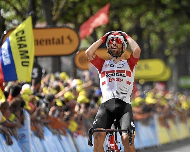Thomas De Gendt (Lotto) ganó ayer la octava del Tour en Saint-Étienne al escaparse de salida con De Marchi, King y Terpstra y ser capaz de aguantar hasta la meta a pesar del trabajo de cinco equipos que desgastaron a todos sus corredores menos a los líderes en la persecución y al ataque final de Alaphilippe y Pinot, que llegaron con veinte segundos al resto de favoritos, lo que les permite colocarse primero y tercero en la general.
