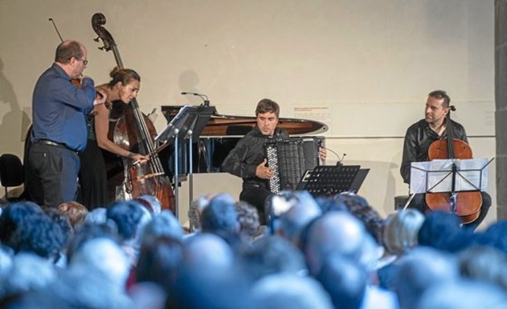 De sobra conocido en Euskal Herria, Iñaki Alberdi es también un acordeonista de referencia a nivel europeo, y aprovechó ese prestigio para reunir a un grupo de intérpretes de gran altura para acompañarle en una maratón de tangos de Piazzolla, un repertorio que el acordeonista de Irun conoce a la perfección. Algunos músicos eran de casa, como el violinista Aitzol Iturriagagoitia o el violonchelista David Apellániz, otros de un poco más lejos, como el pianista Luis Fernando Pérez o la magnífica contrabajista Uxía Martínez Botana, que desde la aparente discreción de la línea de bajo mostró una musicalidad exquisita.