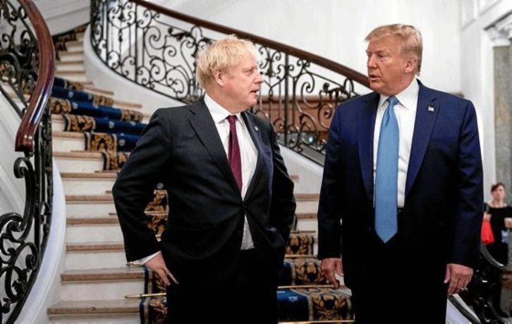 Tras haber amenazado en el avión a tirios y troyanos (China y Francia) con la «madre de todas las batallas de los aranceles» y después de llegar a la cena del sábado con la más cínica de sus sonrisas, el inquilino de la Casa Blanca se reunió a primera hora de ayer en un desayuno de trabajo con el, en sus palabras, «gran primer ministro» británico, Boris Johnson, «el hombre adecuado» para «levantar el ancla alrededor del tobillo» de Gran Bretaña, imagen con la que Trump defendió la salida británica de la UE.