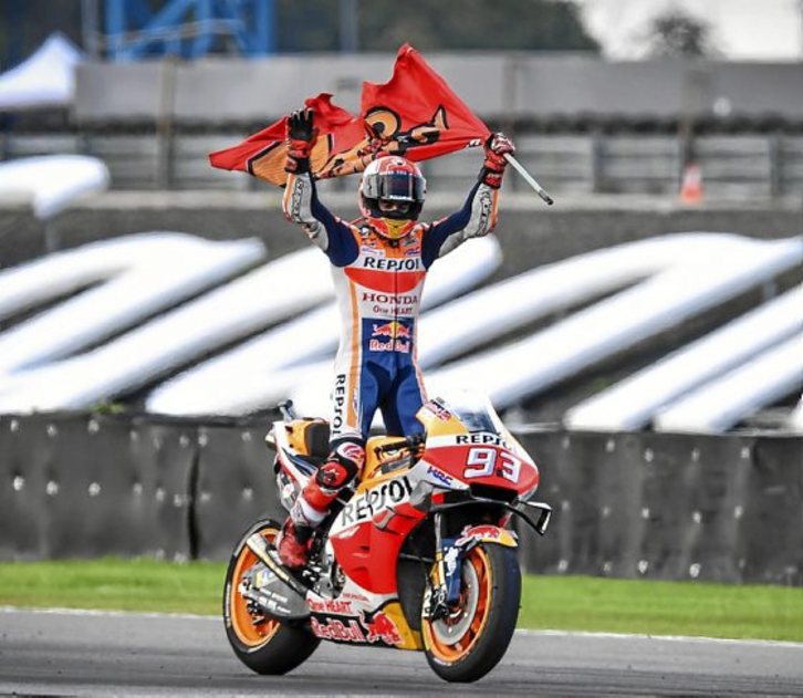 Márquez demostró su ambición al buscar hasta la extenuación la victoria en Tailandia, en el circuito de Buriram, a pesar de que la segunda plaza tras el francés Fabio Quartararo (Yamaha) le bastaba para proclamarse campeón. El piloto de Honda aguantó todo el tiempo tras la estela de Quartararo hasta que a dos vueltas del final protagonizó el primer intento de superarlo con una arriesgada maniobra por el exterior. Sin embargo, no fue hasta el último giro cuando logró superar al francés.