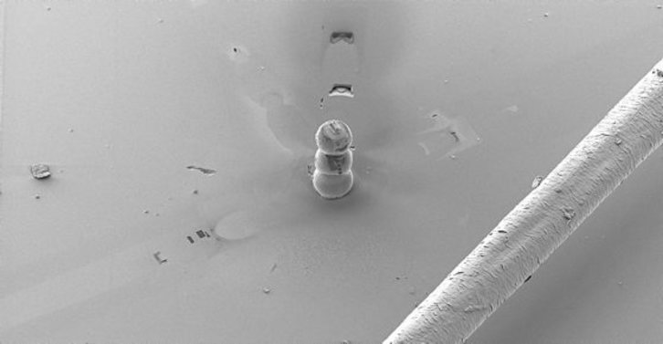Una diminuta réplica en silicio de una casa de jengibre –un conocido producto de repostería–, hecha en el Centro Canadiense de Microscopía Electrónica, podría ser la casa más pequeña jamás creada. El investigador Travis Casagrande edificó esta estructura con todos los detalles y una bandera de Canadá a modo de alfombra de bienvenida. La pequeña maravilla descansa, a su vez, en la cabeza de un muñeco de nieve que Casagrande hizo con un material utilizado en la investigación de baterías de iones de litio. La foto final –arriba– muestra al muñeco de pie junto a un cabello humano que parece un tronco de secuoya.