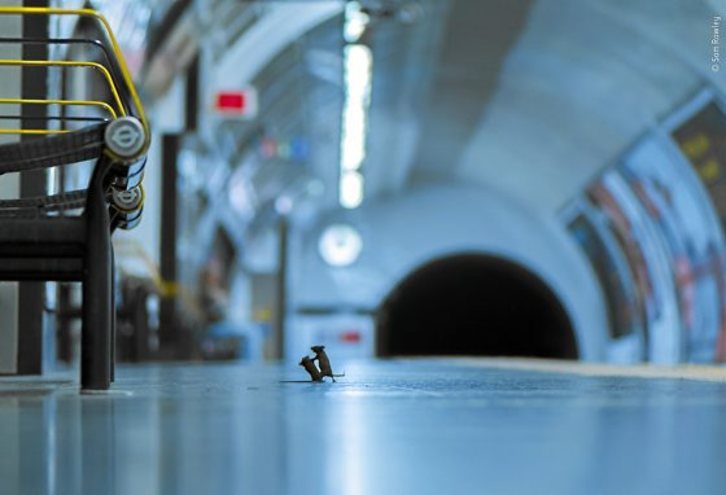 Gezurra badirudi ere, Wildlife Photographer of the Year sarietako bat (zehazki, garaikur profesionalik lortu ez duten irudien lehiakoa) Londreseko metroan ateratako argazki batek eraman du. Sam Rowley gaztearena da eta 28.000 boto bereganatu ditu. Hark kontatu duenez, hainbat gau egin zituen buruz behera etzanda geltoki horretan, irudiko bi saguok bistaratu eta borrokan hasi ziren arte. Eta klik, kameraren botoia sakatu eta iruditzar hau jaso zuen ordainetan.