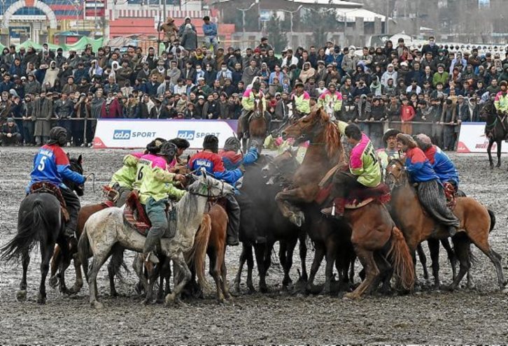 Golpes de fusta, monturas que se encabritan, el cadáver de una cabra como pelota y ... cámaras de TV: Afganistán vive su primer campeonato en buzkashi, deporte de guerra que se remonta ocho siglos atrás y prohibido por los talibanes. En Kabul, miles de personas asisten durante una semana a estas brutales lizas. Los jugadores galopan por el fango tratando de asegurar la posesión del cadáver de 50 kilos para su equipo. Un momento de merecido respiro para el país.
