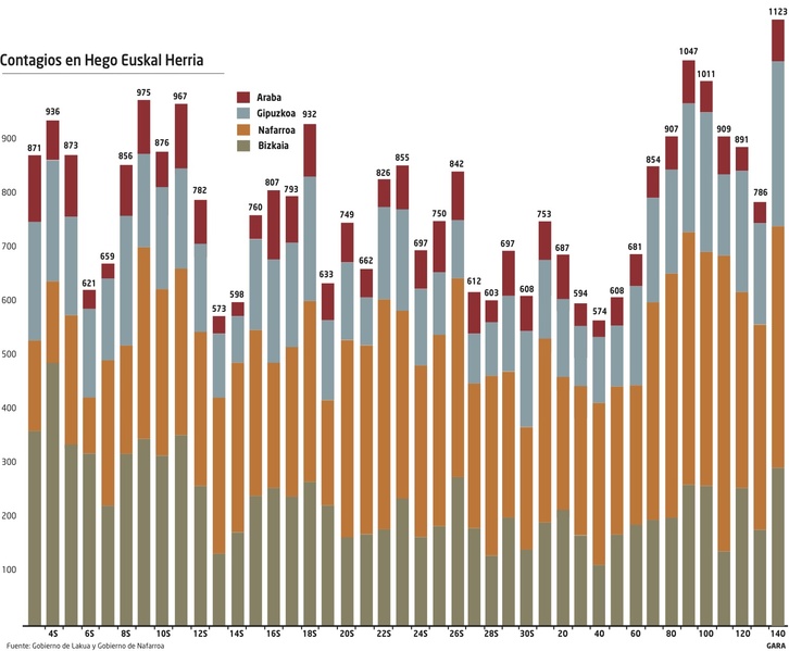 1.123 nuevos positivos, récord diario en Hego Euskal Herria, y nueva marca también en Gipuzkoa, con 303 contagios. Estas dos cifras resumen una jornada que dejó asimismo malos registros en Nafarroa y Bizkaia, con Araba como relativa excepción. Además, se notificaron siete defunciones y ya hay 622 hospitalizados en Euskal Herria, 90 en las UCI.