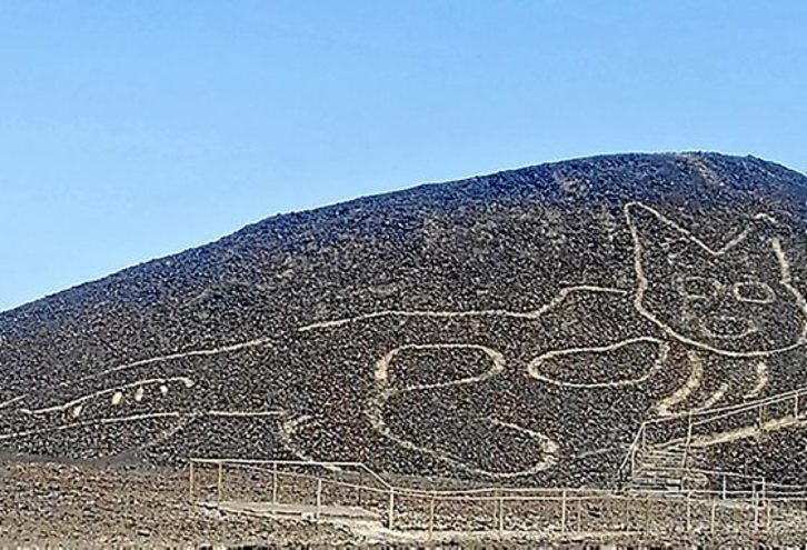 Las obras de mejora del acceso al mirador han sacado a la luz un nuevo geoglifo figurativo gigante en una colina de la Pampa de Nazca: un gato de 37 metros de largo labrado en una de las laderas. Representaciones de felinos de este tipo son frecuentes en la iconografía de la cerámica y los textiles de la sociedad Paracas, que antecedió varios siglos a la Nazca, según el Ministerio de Cultura de Perú. Los hallazgos de líneas y geoglifos revelan que este desierto «tenía un sentido muy especial».
