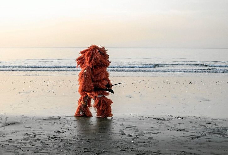 El Kankurang es una mascarada practicada por los mandinga de Gambia y Senegal. Su origen se remonta al Komo, sociedad secreta de cazadores cuyas prácticas esotéricas contribuyeron a la emergencia de los mandinga. Asociado a los ritos de circuncisión e iniciación, su personaje central –en la imagen, en una playa de Senegambia, en Banjul– es un espíritu protector que garantiza el orden y la justicia y aleja el mal. Para eso se viste con hojas, corteza de árbol y fibras vegetales de colores y porta dos machetes.