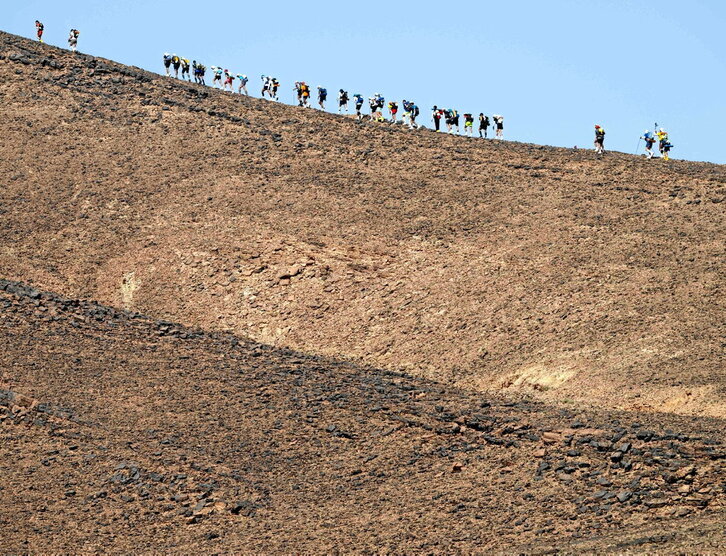 Igandean hasi zen gogorrena, etsigarriena izatearen ospea duen Sablesko Maratoia. Bederatzi egunez -maiatzaren 1era arte-, lasterketaren 37. edizioa korritzen ari diren 1.150 pertsonak 250 kilometro egingo dituzte Saharako desertuan, hauts harrotuen haizeteek, bero boladek nahiz gau hotzen atzetik oinatza uzten segitzeko adorez. Basamortuak ez du engainatzen, eta lehenengo egunetik ondo ezagutzeko aukera izan dute parte hartzaileek: ekaitza, hauts bolada, euri jasa eta 15 graduko tenperatura jaitsiera izan ziren. Ongi etorri pack-a, osorik.