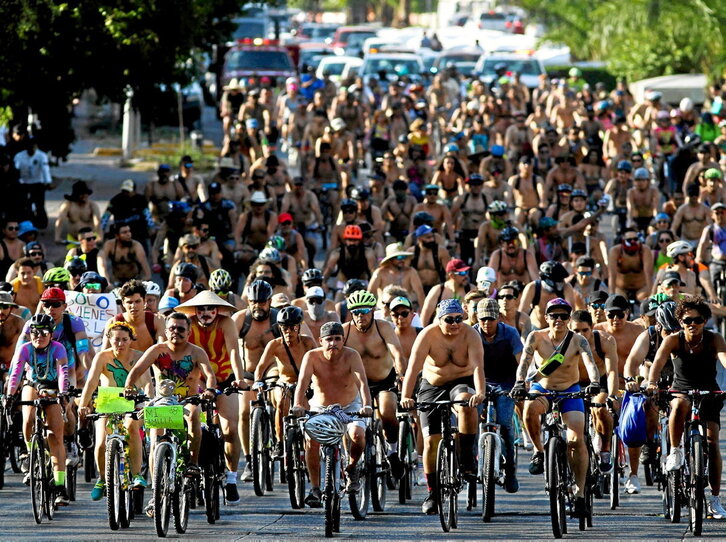 «Bizikleta gainean ez dabil txirrindulari soil bat, baizik eta bizitza bat». Asteburu honetan biluzik atera dira txirrindulariak Jaliscoko (Mexiko) kaleetara, martxa honen 16. edizioan. “World Naked Bike Ride” ekimena 2006. urtean hasi zen, eta txirrindulariek errepidean sumatzen duten zaurgarritasuna deitoratzea da ekimenaren asmo nagusia. Haatik, biluzik ateratzen dira, istripuetan ohiko aitzakia izaten den «ez nuen ikusi» arrazoia balio gabe uzteko. Bizikleta «askatasunaren» sinbolo harturik, zirkulazio segurua eta auto, oinezko eta txirrindularien arteko errespetua aldarrikatu dute. Ulises RUIZ | AFP