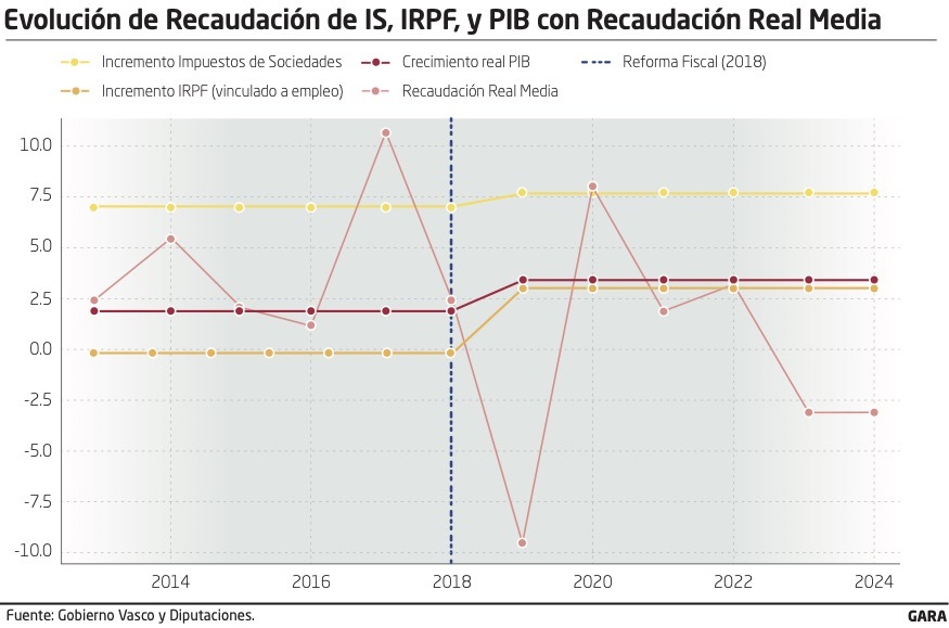 PNV, PSE y PP pactaron a finales de 2017, dentro su negociación presupuestaria, una reforma fiscal que fue aprobada por las Juntas Generales de cada territorio en los primeros meses de 2018. Un análisis de las cifras y de la evolución del PIB evidencia que, contra lo que dice el discurso oficial, la recaudación real media ha bajado en la CAV comparado con el periodo 2013-2018.