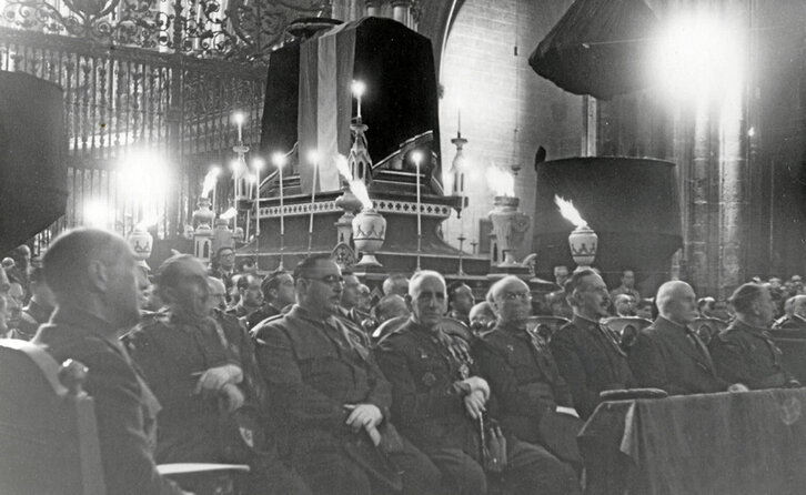 1939ko urriaren 22an, frankistek gerra irabazi eta urte erdira, Jose Sanjurjo jeneralaren gorpuzkiak Iruñeko katedralera iritsi ziren. Sanjurjo 1936ko uztailaren 18ko estatu kolpearen protagonistetako bat izan zen, baina bi egun geroago hegazkin istripuan hil zen. Ekitaldian, jeneral frankisten eta Philippe Petain mariskalaren atzean, Sanjurjoren hilotza daraman katafalkoa ikus daiteke. Victor Eusak diseinatu zuen. Udalak Sanjurjo katedraletik atera zuen 2016an, eta Eusa laster eroriko da hiriko kale izendegitik.