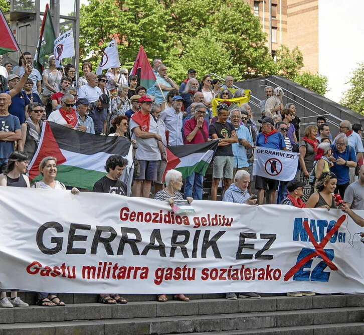 En el marco de la cumbre que la OTAN ha realizado en La Haya para incrementar el gasto militar a un 5% del PIB, tal y como exigía Donald Trump, diferentes agentes sociales de Euskal Herria se movilizaron ayer en Bilbo, Donostia, Gasteiz e Iruñea para mostrar el rechazo a la militarización y a la OTAN «que nos avoca a guerras».