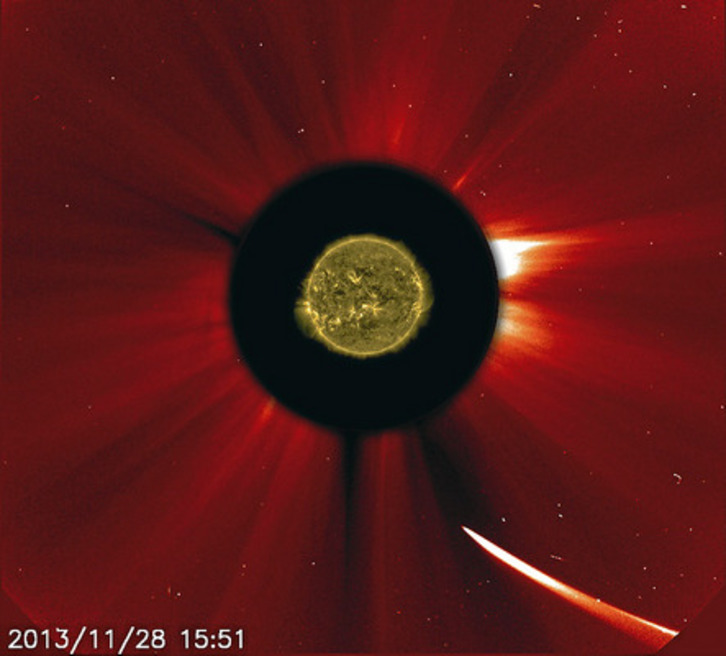 Ikusmin handia zegoen ostegunean ISON kometak Eguzkia ia laztanduz egin behar zuen bidaiaren inguruan. 1,8 milioi kilometro ingurura hurbilduko zela iragarri zuten astronomoek (kontuan izan behar da Halley kometa 90 milioi kilometrora igaro zela 1986an). Elhuyar aldizkariak jasotzen zuenez, iluntzean ailegatu zen periheliora ISON, eta, SOHO behatokiaren atzo goizeko irudiek erakusten zutenez, nukleoa izan daitekeen zati batek soilik iraun du.