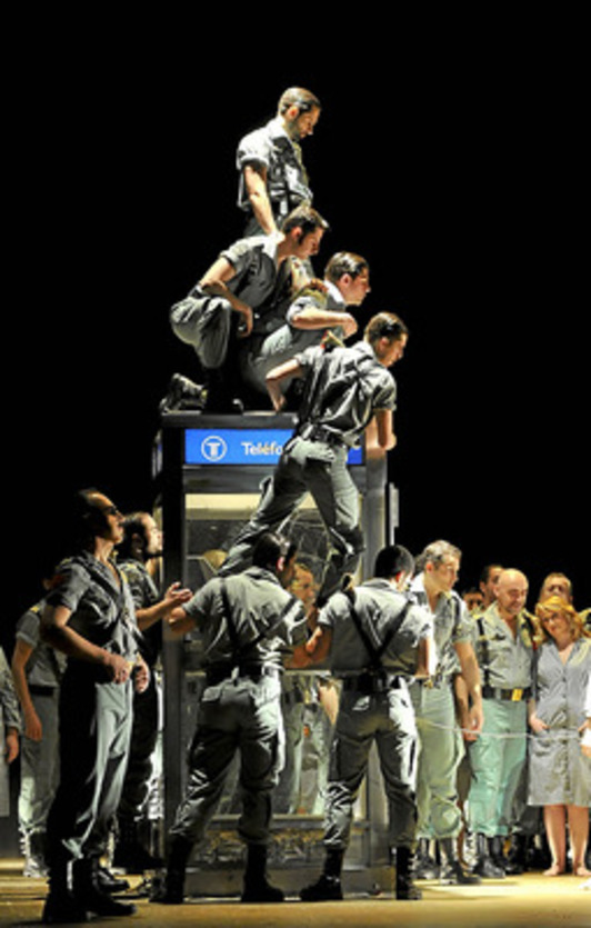 Bieito, enfant terrible de la dirección escénica en los 90 y con gran proyección internacional en los últimos años, se hizo famoso en el mundo de la ópera con escenas como la de la conjura de «Un ballo in maschera» de Verdi, en la que los aristócratas traidores planeaban el asesinato del rey mientras defecaban sentados en retretes; o con un «Don Giovanni» de Mozart en el que el protagonista era alcohólico, cocainómano y adicto al sexo. Esta «Carmen», aunque propone imágenes sorprendentes -comienza con un hombre corriendo en ropa interior durante toda la primera escena-, no es tan provocadora como otros trabajos del mirandés.