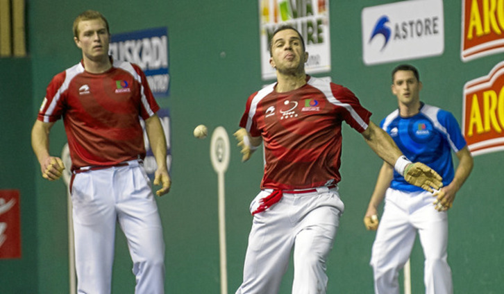 Gran culpa de ello la tuvo Aimar Olaizola, quien salió al rescate de su zaguero a tiempo y firmó un auténtico partidazo, una vez más. El delantero de Goizueta deleitó al respetable con diez remates de bellísima factura, y estuvo especialmente eficaz con la izquierda, logrando hasta siete ganchos, cada uno más milimétrico que el anterior. Se llevó las mayores ovaciones de la tarde merecidamente.