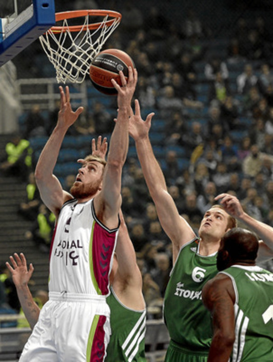 Su influencia fue mayor porque los tiradores baskonistas también acertaban hasta cuatro triples sin fallo. Así, Laboral Kutxa Baskonia hizo sonar las alarmas del OAKA al irse 38-50, con un Diamantidis borrado por Causeur. Dos triples de Maciulis y Bramos recortaban la ventaja baskonista a la mitad, pero San Emeterio y Causeur emergían para poner el duelo 44-55 al inicio del cuarto período.