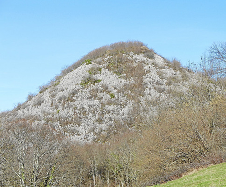 Una amplia pista de grava nos llevará entre prados con la vista puesta en el objetivo hasta llegar a la base del picacho de Rocabrune, donde finaliza entre prados y hay dos portillos. Desde aquí el roquedo salpicado de avellanos cubre todas las laderas de esta montaña, ofreciendo un aspecto inaccesible. Aquí hemos de cruzar el portillo de la izquierda para cruzar unos prados hasta situarnos junto unos solitarios robles, donde se encuentra el camino de regreso a Monjelose por Gamarte.