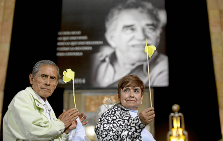 Acompañado por la viuda del escritor, Mercedes Barcha, y sus hijos, Gonzalo y Rodrigo, el funcionario salió de la puerta que da acceso al teatro abrazando la caja de madera. Los aplausos estallaron y, cuando parecía que terminarían, una voz en el primer piso, donde se ubicó a la prensa, gritó: «¡Gracias, Gabo!», y la ovación se intensificó hasta completar un par de minutos más.