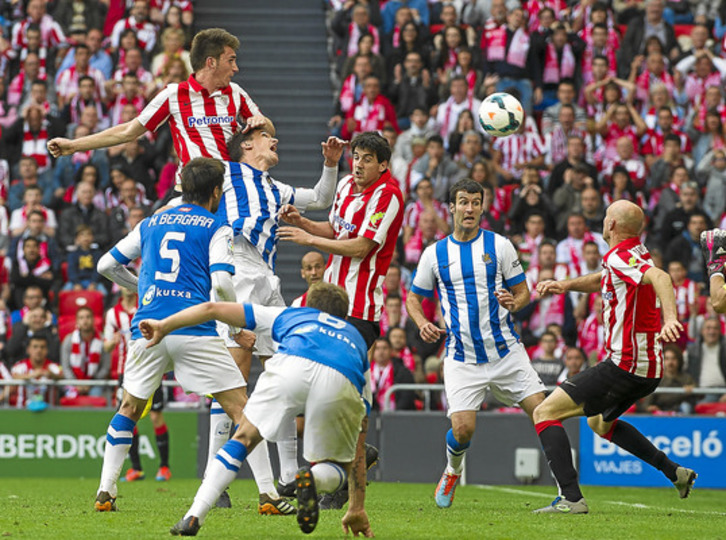 Con el ya clásico desde hace meses «¡Athletic Champions League!» en la grada, arrancaba el primer derbi entre bilbainos y donostiarras en el nuevo estadio, y que ayer vistió sus mejores galas. Los primeros pitos al realista Iñigo Martínez dieron paso a sendos avisos del mexicano Vela, sin problemas para un siempre atento Iraizoz. Fue mejor la Real en esos primeros quince minutos, ante un Athletic con salida lavolpiana -Iturraspe como tercer central y los laterales muy arriba-, pero sin la velocidad necesaria para sorprender a los de Arrasate, que salían rápidos y se replegaban bien, obligando a los de Valverde siempre a ataques estáticos y, lo peor, sin ganar ni una sola segunda jugada.