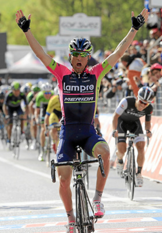 Desaparecido en las Ardenas, el talento del joven del Lampre emergió en la parte final de otra jornada de gran desgaste para acelerar en los últimos cien metros y obtener su segunda victoria en la prueba italiana, tras la polémica de 2011, cuando Giovanni Visconti fue relegado a la tercera posición por entender los jueces que empleó los codos en el sprint de un grupo en el que también estaba Lastras.