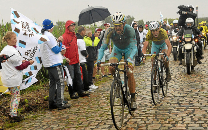 Pero la carrera se dinamitó en el segundo tramo de pavés, en el que Contador no pudo seguir la rueda de los más fuertes y se quedó por delante un grupo reducido. Cuando tuvieron conocimiento de que el madrileño se había descolgado, comenzaron a tirar con fuerza Astana y el Lotto hasta que Vandenbroeck cogió mal una curva y se salió del adoquinado hacia el prado.