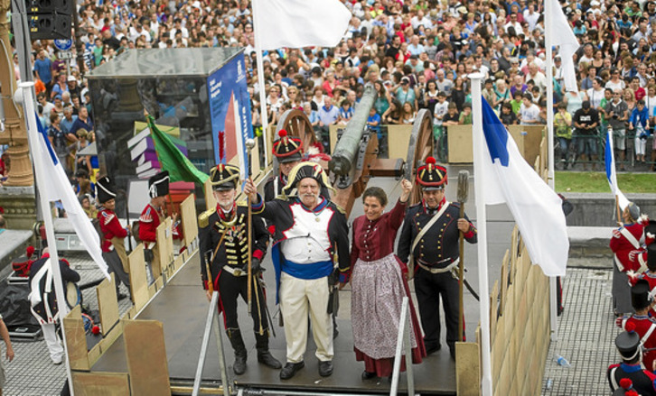 Un Alderdi Eder abarrotado aguardaba la llegada del Batallón de Honores de la Cofradía Vasca de Gastronomía junto a la banda de música de Trintxerpe, Illumbe. Y desde diferentes puntos del centro fueron arribando Los Bebes de la Bulla, Deiadar 'Taupada y Sambatuak, así como la Comparsa de Gigantes y Cabezudos, dando al inicio de las fiestas un toque multicolor. Txistus, fanfarres y batukadas confluyeron simultáneamente hasta que llegó el momento de cantar y bailar el esperado ``Artillero''.