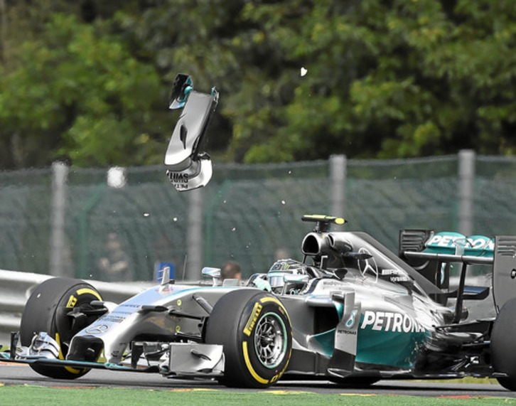 En la vuelta 2, Rosberg pretendía adelantar a su compañero en Les Combes, pero Hamilton le cerraba bien la puerta, como cualquier buen piloto que defiende su posición. Por el motivo que sea, Rosberg no levantaba lo suficiente ni cambiaba su línea; como consecuencia, el ala frontal del alemán contactaba con la rueda trasera-izquierda de Hamilton. En mi opinión fue un error de Rosberg, que perjudicó su propia carrera y sobre todo echaba por tierra lo que debería de haber sido un cómodo doblete de Mercedes en Spa. Lo único positivo que Rosberg obtuvo fue el aumento de su ventaja respecto a Hamilton.
