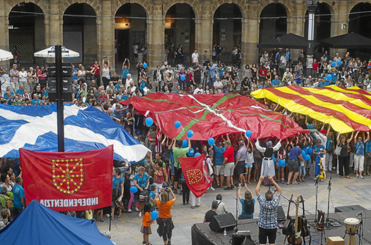 No faltaron imágenes intercaladas de la cadena entre Durango e Iruñea, la grandiosa expresión ciudadana en las principales arterias de Barcelona ni referencias a Catalunya y Escocia, realidades diferentes con un punto en común, porque en ambos casos son los ciudadanos quienes han decidido qué, cuándo y cómo deben preguntar y todos aceptarán los resultados sean los que sean, tal y como resaltó Zelai Nikolas en la alocución que cerró el acto.