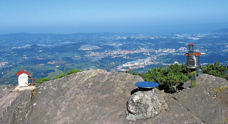 Continuar recto en pendiente pronunciada y más tarde por la izda, de manera inteligente, permite alcanzar la cúspide. Desde aquí, el que quiera... a su cruz... Zubieta y sus desastres alcanzan desde aquí su verdadera dimensión. La falta de ordenación del Oria y Urumea, (aniquilados los conceptos de «capacidad y aptitud» del espacio) y la colmatación del territorio, quedan en evidencia delante de nuestros ojos, en la cabeza del Buruntza. Aún más para los que guardamos en la mente nuestra primera ascensión.
