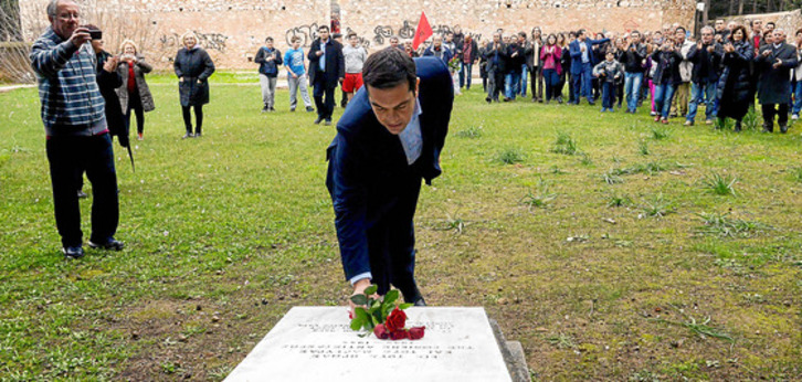 La ceremonia sirvió, además, para mostrar algunos de sus compromisos. Fue llevada a cabo sin la alta jerarquía de la iglesia ortodoxa, sin crucifijo, biblia, ni corbata. Inaudito en Grecia. Tsipras se dirigió acto seguido hacia el distrito de Kessariani. Pocos minutos después de convertirse en primer ministro llevaba a cabo su primera visita oficial, y fue para realizar una ofrenda floral a los miembros de la resistencia ejecutados por los nazis durante la ocupación. 200 comunistas, víctimas de una de las peores matanzas llevadas a cabo por las tropas alemanas en la capital griega, fueron homenajeados por el nuevo primer ministro y un grupo de descen- dientes de los partisanos, dando lugar a un hecho sin precedentes.