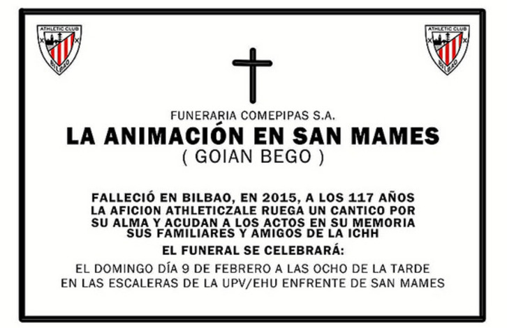 Los grupos que conforman la Iñigo Cabacas Herri Harmailla han convocado para este domingo, a las 20.00, antes del encuentro ante el Barça, una concentración en las escalinatas de la UPV-EHU junto a San Mamés a modo de «funeral por el fallecimiento de la animación de nuestra querida Catedral». Lamentan que «vemos con tristeza cómo no hemos sabido o podido contagiar a San Mamés del espíritu del viejo campo», de igual manera que explican su intención de «crecer, y hacer cosas en común con el resto de la masa social, intentar crear un ambiente mejor en nuestro desconocido campo» y que esta grada de animación tenga una mayor capacidad, como reclaman al club. J.V.