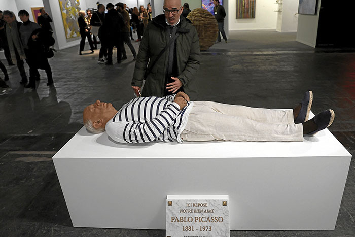 Pero no todas las maneras de acudir a Picasso en este aniversario se centran en su comportamiento con sus parejas. La oportunidad que presenta el tirón comercial de su nombre no ha pasado desapercibido para ser utilizado como reclamo. Sin ir más lejos, en la pasada Feria ARCO Madrid, la mayor cantidad de portadas y fotografías las captó la obra del artista Eugenio Merino. ‘Aquí murió Picasso’ es una escultura hiperrealista que representa al cadáver del pintor, ataviado con su característica camiseta de rayas horizontales y sus alpargatas. Si bien se supone que la pieza es una crítica hacia la utilización de la figura de Picasso como atractivo comercial, está claro que la propia presentación de la figura en la feria supuso precisamente eso, una apuesta quizás algo frívola y orientada claramente a conseguir protagonismo y líneas en artículos y reseñas sobre la feria.