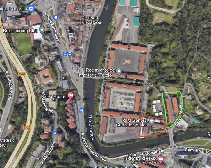 Vista aérea de los terrenos de Loiola, con los bloques de viviendas rodeados en verde y la residencia militar en rojo. (GOOGLE MAPS)