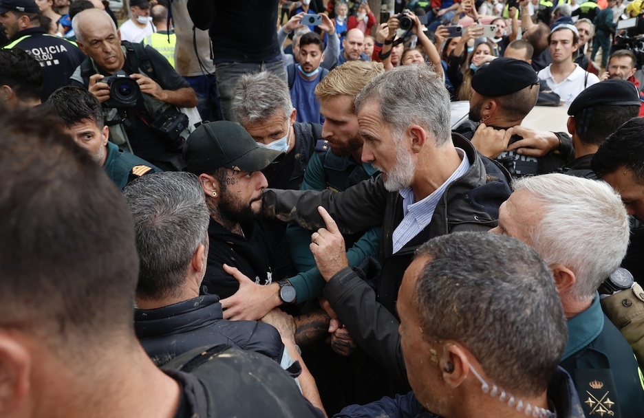 Con la cara manchada de barro, igual que su abrigo, el monarca español ha avanzado por una de las calles principales de esta localidad, una de las más afectadas por la DANA, y ha tratado de tranquilizar a varios de los voluntarios, cuyas recriminaciones ha escuchado cara a cara.